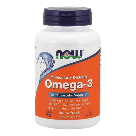 NOW Omega-3 Softgels deliver molecularly distilled fish oil concentrate to support heart, brain, joint, and eye health. Each softgel provides 180 mg of EPA and 120 mg of DHA—two essential omega-3 fatty acids known for their anti-inflammatory and cardiovascular benefits. Cholesterol-free and odor-controlled, these softgels are ideal for daily wellness.
